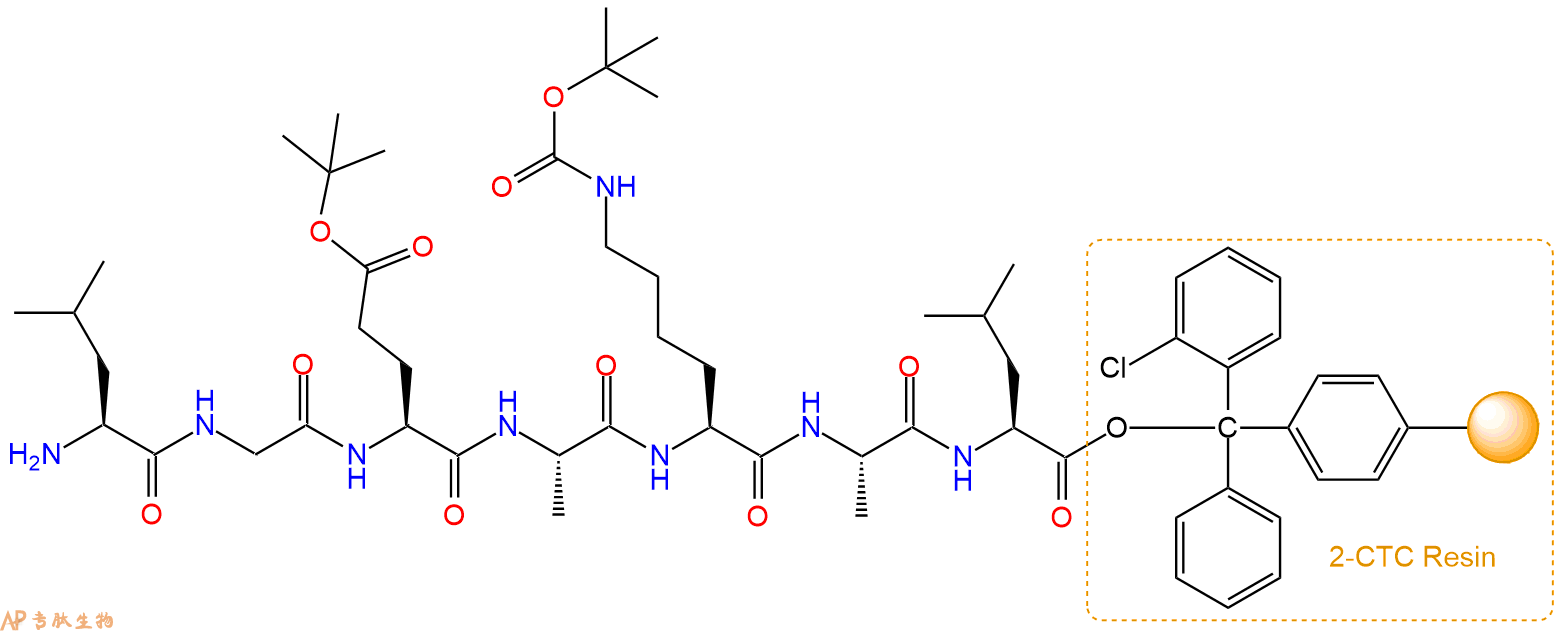 最后再经过步骤二得到 H2N-Leu-Gly-Glu(OtBu)-Ala-Lys(Boc)-Ala-Leu-CTC Resin,结构如如下: