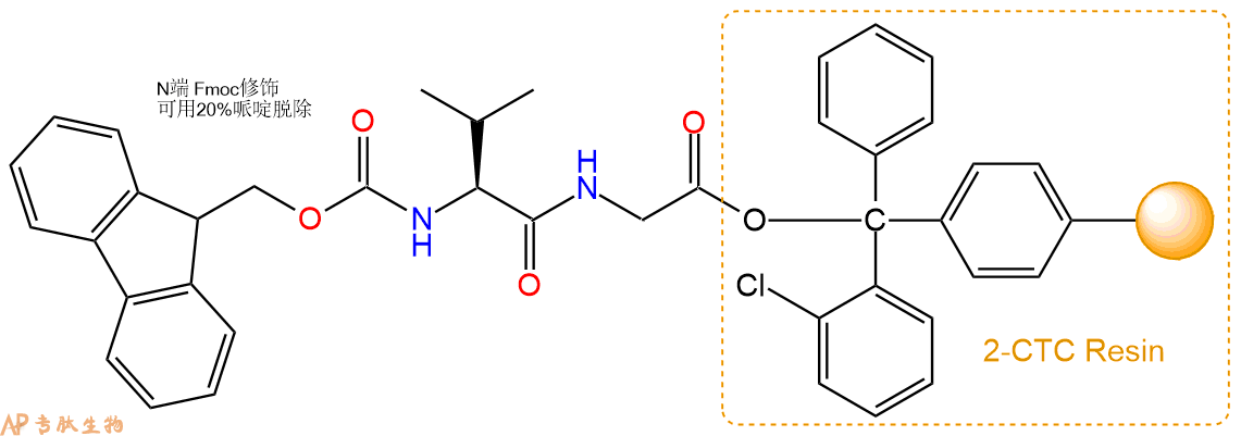 3、缩合:取2.7mmol Fmoc-Val-OH 氨基酸,加入到上述树脂里,加适当DMF溶解氨基酸,再分别加入1.8mmol DIPEA,1.67mmol HBTU。反应30分钟后,用2倍树脂体积的DMF 洗涤3次树脂。(洗涤树脂,去掉残留溶剂,为下一步反应做准备)。得到Fmoc-Val-Gly-CTC Resin。氨基酸:DIPEA:HBTU:树脂=3:6:2.85:1(摩尔比)。结构图如下: