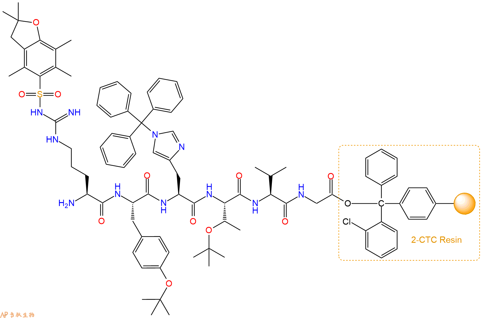 最后再经过步骤二得到 H2N-Arg(Pbf)-Tyr(tBu)-His(Trt)-Thr(tBu)-Val-Gly-CTC Resin,结构如如下: