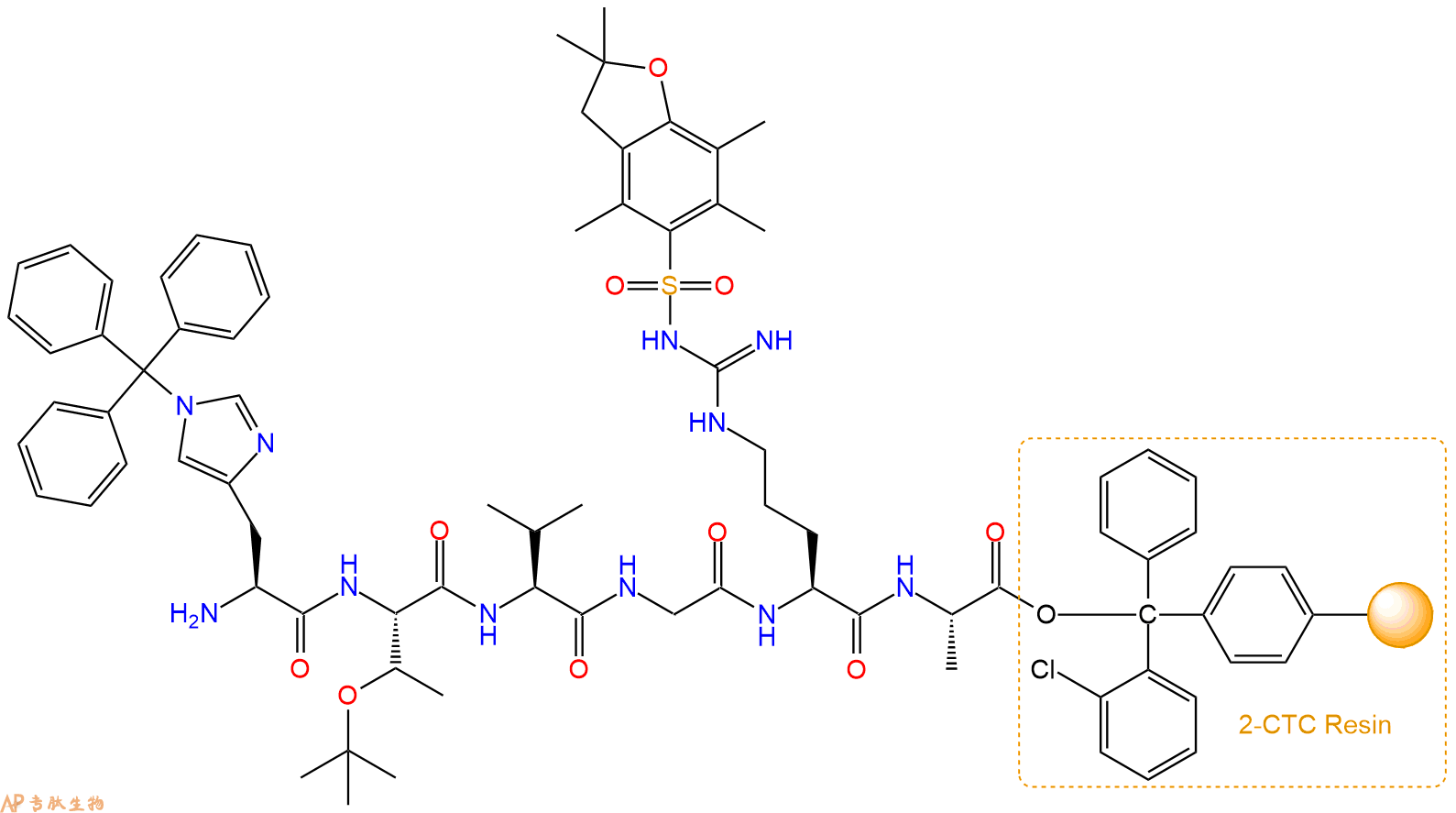 最后再经过步骤二得到 H2N-His(Trt)-Thr(tBu)-Val-Gly-Arg(Pbf)-Ala-CTC Resin,结构如如下: