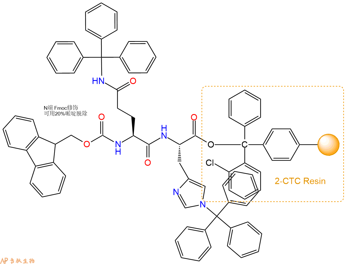 1、合成CTC树脂:称取0.3g CTC Resin(如初始取代度约为1.0mmol/g)和0.4 mmol的Fmoc-His(Trt)-OH于反应器中,加入适量DCM溶解氨基酸(需要注意,此时CTC树脂体积会增大好几倍,避免DCM溶液过少),再加入树脂0.9 mmol的DIPEA((Mw:129.1,d:0.740g/ml)),反应2-3小时后,可不抽滤溶液,直接加入1ml的HPLC级甲醇,封端半小时。依次用DMF洗涤2次,甲醇洗涤1次,DCM洗涤一次,甲醇洗涤一次,DCM洗涤一次,DMF洗涤2次(这里使用甲醇和DCM交替洗涤,是为了更好地去除其他溶质,有利于后续反应)。得到Fmoc-His(Trt)-CTC Resin备用。结构图如下: