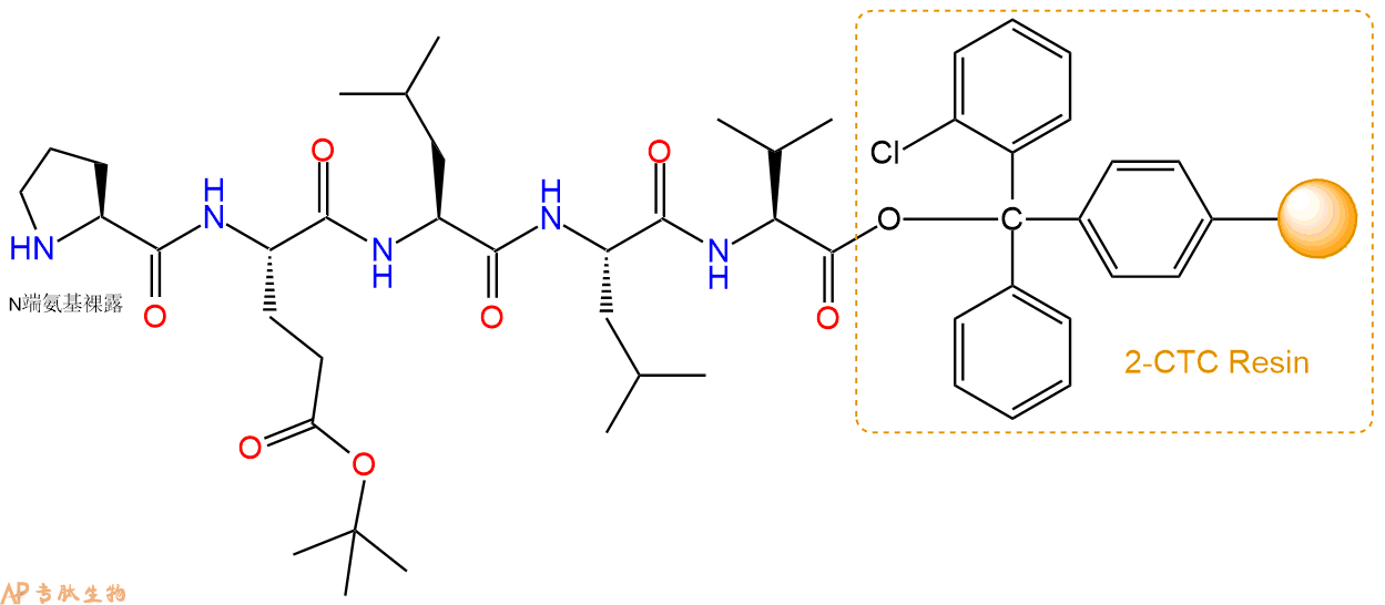 最后再经过步骤二得到 H2N-Pro-Glu(OtBu)-Leu-Leu-Val-CTC Resin,结构如如下: