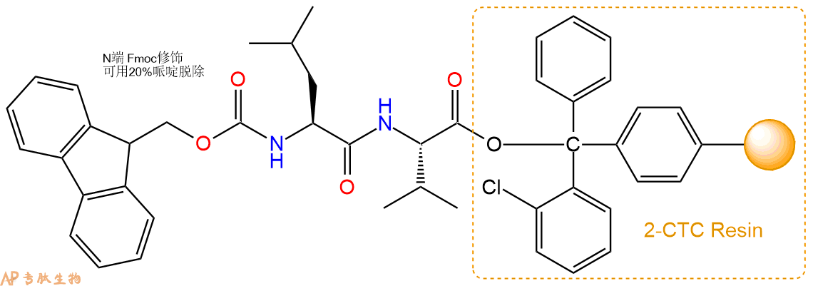 1、合成CTC树脂:称取0.3g CTC Resin(如初始取代度约为1.0mmol/g)和0.4 mmol的Fmoc-Val-OH于反应器中,加入适量DCM溶解氨基酸(需要注意,此时CTC树脂体积会增大好几倍,避免DCM溶液过少),再加入树脂0.9 mmol的DIPEA((Mw:129.1,d:0.740g/ml)),反应2-3小时后,可不抽滤溶液,直接加入1ml的HPLC级甲醇,封端半小时。依次用DMF洗涤2次,甲醇洗涤1次,DCM洗涤一次,甲醇洗涤一次,DCM洗涤一次,DMF洗涤2次(这里使用甲醇和DCM交替洗涤,是为了更好地去除其他溶质,有利于后续反应)。得到Fmoc-Val-CTC Resin备用。结构图如下: