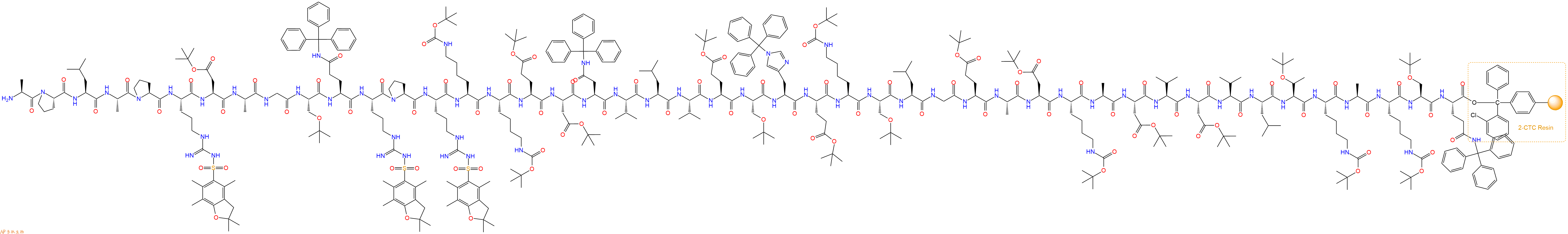 最后再经过步骤二得到 H2N-Ala-Pro-Leu-Ala-Pro-Arg(Pbf)-Asp(OtBu)-Ala-Gly-Ser(tBu)-Gln(Trt)-Arg(Pbf)-Pro-Arg(Pbf)-Lys(Boc)-Lys(Boc)-Glu(OtBu)-Asp(OtBu)-Asn(Trt)-Val-Leu-Val-Glu(OtBu)-Ser(tBu)-His(Trt)-Glu(OtBu)-Lys(Boc)-Ser(tBu)-Leu-Gly-Glu(OtBu)-Ala-Asp(OtBu)-Lys(Boc)-Ala-Asp(OtBu)-Val-Asp(OtBu)-Val-Leu-Thr(tBu)-Lys(Boc)-Ala-Lys(Boc)-Ser(tBu)-Gln(Trt)-CTC Resin,结构如下: