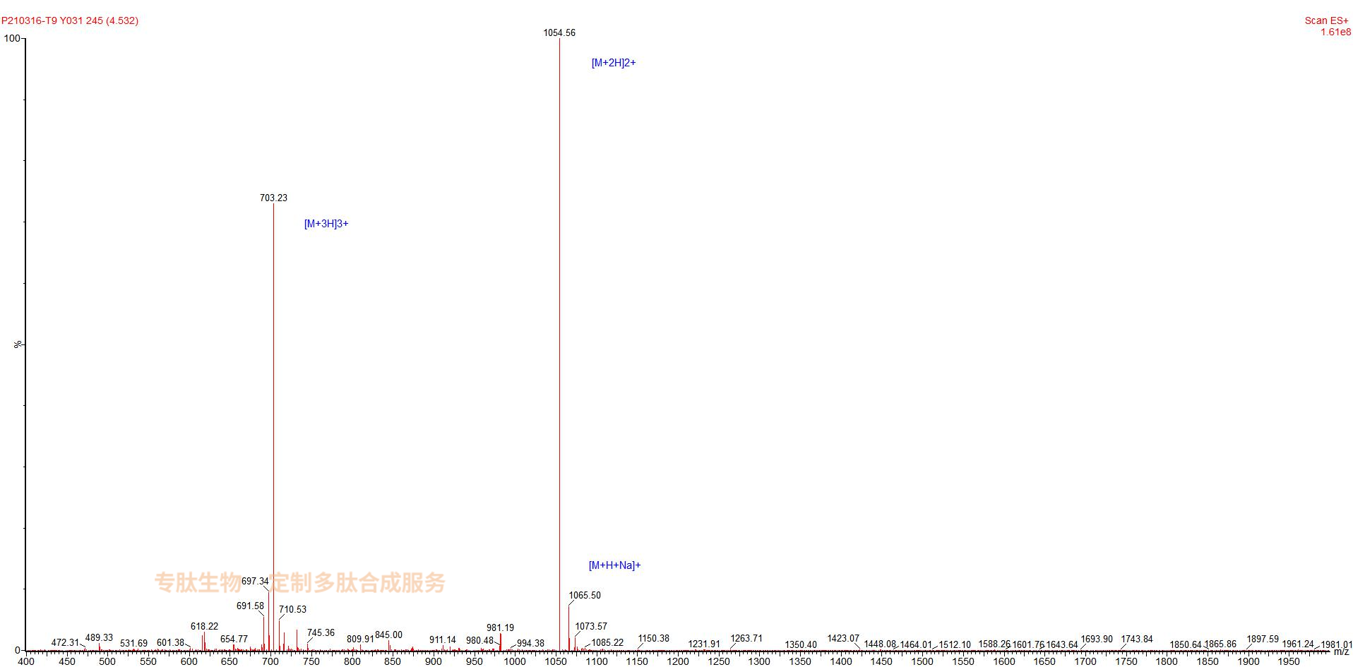 假如图谱中出现不止2个峰,计算方法是一样的,计算出来的数值也都应该和目标分子量接近(误差允许范围内)。当然多肽产品测质谱时,可能分子量会增加23(钠离子),39(钾离子),114(三氟乙酸根),44(携带二氧化碳)等,这是需要减对应的数值,或减去对应数值的整数倍。