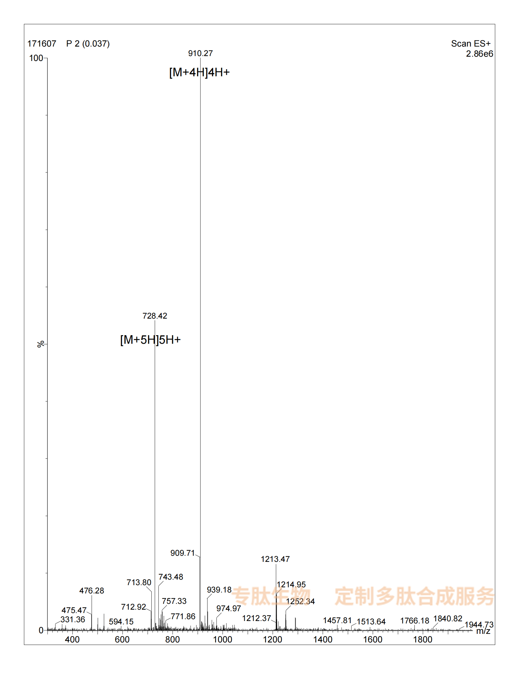 我们以第二个为例,图谱中有2个比较高的峰,分别是728.42 (旁边备注了+5H,可以理解为加了5个正电荷的意思)、910.27(旁边备注了+4H,可以理解为加了4个正电荷的意思)