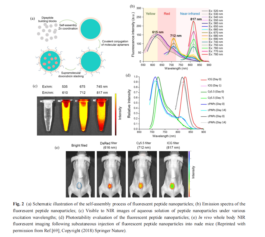 例如:受黄色荧光蛋白的荧光红移(J 型 π-π 堆积作用)和蓝色荧光蛋白的荧光增强现象(金属 配位)启发,Fan 等[68]设计并合成了具有良好的光 稳定性的自荧光多肽纳米颗粒, 以Trp-Phe 二肽 作为基元,通过Zn2+配位、苯环叠加和氢键相互 作用自组装成纳米粒(图2(a)) ,使其荧光波长从 天然氨基酸的不可见紫外区域红移到可见光区 域,实现了特异性细胞成像和药物释放的实时 监测.