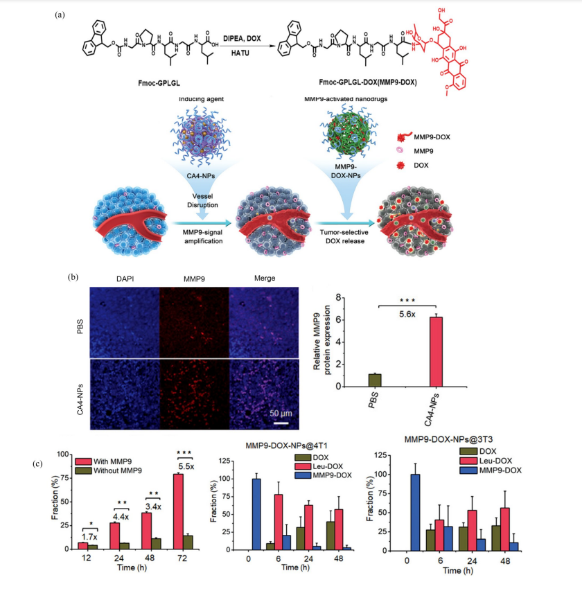 例如:Ding 等[79] 合成了一种聚氨基酸,其 与2,3-二甲基马来酸酐修饰的阿霉素共组装可形 成复合胶束,该胶束能在肿瘤细胞的酸性微环境 中解离并释放阿霉素 . 此外,Chen 等[80]设计了一 种 基 于 多 肽 (Fmoc-Gly-Pro-Leu-Gly-Leu) 的 酶 激活前药,与药物产生级联作用抑制肿瘤生长 (图 5(a)):利用血管阻断剂康普瑞汀(CA-4)选择 性破坏未成熟的肿瘤血管,加剧肿瘤缺氧状态以 诱导癌细胞中MMP-9 过表达(图5(b)) ,进一步协 同MMP-9 激活阿霉素前药(MMP9-DOX-NPs)提高化疗的选择性,减少毒副作用(图5(c)).