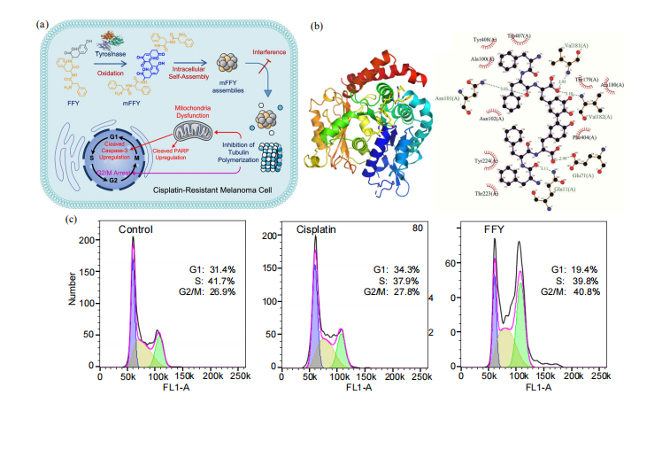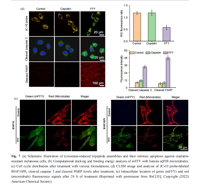他们还利用多肽的胞内自组装来调控耐药肿 瘤细胞的细胞周期,进而逆转并抑制耐药黑色素 瘤[35] . 首先向耐药黑色素瘤细胞中引入三肽(Phe- Phe-Tyr, FFY) ,在细胞内通过酶促自组装形成了 mFFY 多肽纳米粒(图7(a)). 分子对接模拟发现胞 内氧化后的多肽与人源 “/β1B 微管蛋白形成了更 多的结合位点(图7(b)). 将mFFY 多肽纳米粒与微 管蛋白共孵育后,其能够有效抑制微管蛋白聚 合,导致大多数肿瘤细胞停滞于DNA 合成后期 或分裂间期,从而抑制肿瘤细胞增殖(图7(c)). 同 时,线粒体功能紊乱也诱导了凋亡因子过表达, 如 cleaved caspase 3 (相比对照组提高 3. 1 倍)和 cleaved PARP (提高 6.3 倍) ,这进一步促进了耐 药肿瘤细胞凋亡,最终实现了肿瘤耐药性逆转 (图7(d)). 通过共聚焦荧光成像分析,mFFY 多肽 纳米粒能够有效靶向微管,降低胞内微管蛋白聚 合水平,并利用自发荧光实现胞内微管的特异性 成像(图 7(e)). 动物实验中,在黑色素瘤周注射FFY 后,观察到高水平的耐药肿瘤抑制 . 相对于 化疗药物的治疗,该多肽胞内自组装的方法能够 有效减少系统毒性,有望为耐药肿瘤的治疗提供 新策略.