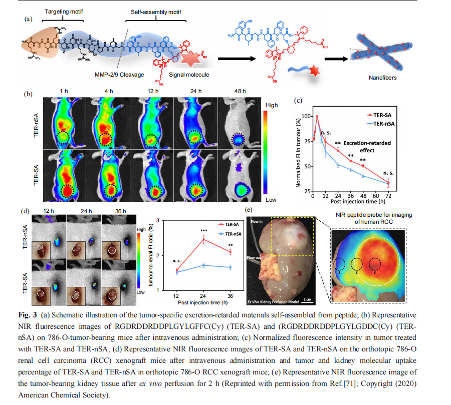 Wang 等[71]通过原位自组装制备了近红外荧 光多肽材料,其在肿瘤病变中具有肿瘤特异性排 泄 延 迟 (tumor-specific excretion-retarded , TER) 效应,可对肾肿瘤进行高性能成像,并实现肿瘤 完全切除,最终减少术后复发 . 该多肽由靶向性 序 列 Arg-Gly-Asp (RGD) 、 酶 响 应 性 序 列 Pro- Leu-Gly-Tyr-Leu 、 自组装序列 Gly-Phe-Phe-Cys 和花菁基团组成 . 首先通过RGD 靶向肿瘤病灶, 随后被肾癌细胞内过表达的基质金属蛋白酶-2/9(MMP-2/9)裂解,余下的多肽残基在肿瘤病灶处 进一步原位自组装形成纳米纤维(图3(a)). 相较于 对照组,注射该多肽组的小鼠肿瘤部位具有更 强的荧光信号,表现出了理想的排泄延迟效应 (图 3(b)和 3(c)). 此外,通过比较荧光强度发现,在注射纳米粒后,肿瘤部位成像的信噪比得到了显著提高(图3(d)). 在原位肾细胞癌模型中,整个肿瘤边界清晰可见,因此该材料有望应用于荧光成像引导的肿瘤手术(图3(e)).
