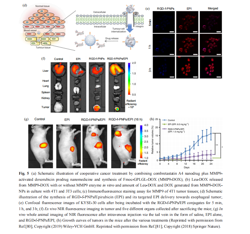 此外,通过赋予多肽/聚氨基酸自组装材料 靶向功能,可有效提高治疗效果并降低化疗药物 的副作用 . Fan 等[81] 设计并合成了一种环八肽 (cyclo(-(D-Ala-L-Glu-D-Ala-L-Trp)2-)) ,其与Zn2+配 位组装形成自荧光环肽纳米粒(f-PNPs). 进一步 修饰具有癌细胞靶向能力的RGD 多肽,使其能 够特异性识别食道癌细胞表面的 αvβ3 整合素,同 时通过 π-π 堆积和电荷吸引作用负载化疗药物表 阿霉素(图5(d)). 随着表阿霉素的逐渐释放,其荧光强度逐渐增强,使得药物在胞内的释放可以在 共聚焦荧光显微镜下实时观测(图5(e)). 此外,动 物实验进一步表明,此自荧光环肽纳米粒作为可 示踪的靶向载药系统可以实现体内肿瘤的特异性 成像(图 5(f))以及药物递送和释放的可视化监测 (图5(g)) ,进而提高了抗癌效率(图5(h)) ,为实时 跟踪病灶区域药物浓度和释放速度提供了新 方法.