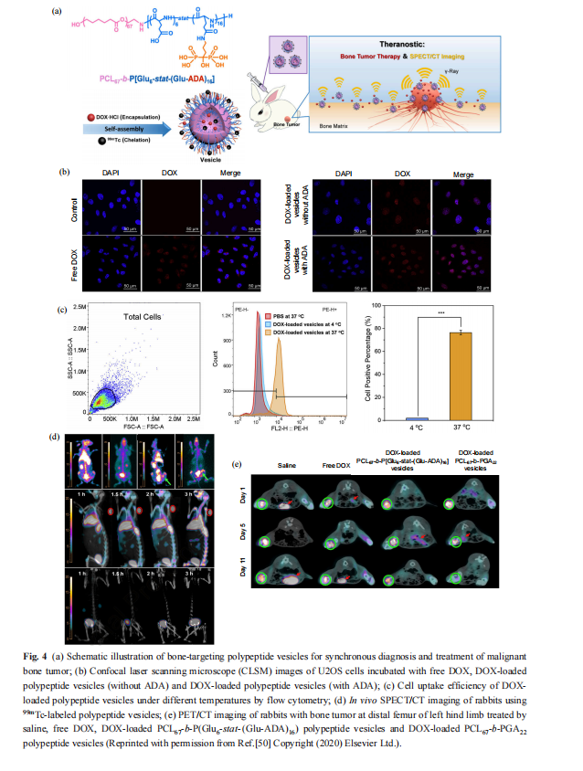 SPECT/CT 是一种较新的双模态成像技术, 它不仅能够提供分子生物学信息,还可提供解 剖学信息,从而提高诊断效果[73] . 然而,临床常 用的 SPECT/CT 造影剂 , 如99 mTc 、 123I 和 111In, 缺乏靶向能力,毒副作用大,而且诊断精确度不高[74] . 多肽/聚氨基酸自组装材料可以通过鳌合负载相关造影剂并利用特定多肽序列靶向病灶 处以提高成像诊断的精准性和造影剂的生物相 容性. Du 等[50]通过自组装制备了一种具有多模态 成像功能的骨靶向聚氨基酸囊泡,可同时用于成 像诊断和治疗恶性骨肿瘤 . 他们利用亲骨性多肽 作为骨靶向基团和自组装骨架,同时在聚氨基酸 链段上修饰阿仑磷酸(ADA) ,其既可与骨组织中 的羟基磷灰石结合靶向骨组织,又可与核素锝结 合并用于骨肿瘤的 SPECT/CT 成像(图 4(a)). 同 时,通过共聚焦荧光成像(图4(b))和流式细胞术 (图 4(c))验证了聚氨基酸囊泡较高的进胞效率 . 此外,在原位骨肿瘤兔模型中,通过 SPECT/CT 动态监测阿仑磷酸螯合的99 mTc 以观察体内的药 物分布(图4(d));体内 SPECT/CT 成像显示,给药后3h,骨组织处的影像信号逐渐增强;而注射 游离99 mTc 的兔子仅在肾脏和膀胱中观察到信号, 这证明了该聚氨基酸囊泡的骨靶向成像能力(图4 (e)) ,为实现针对骨肿瘤的实时成像诊断和有效 治疗提供了新策略.