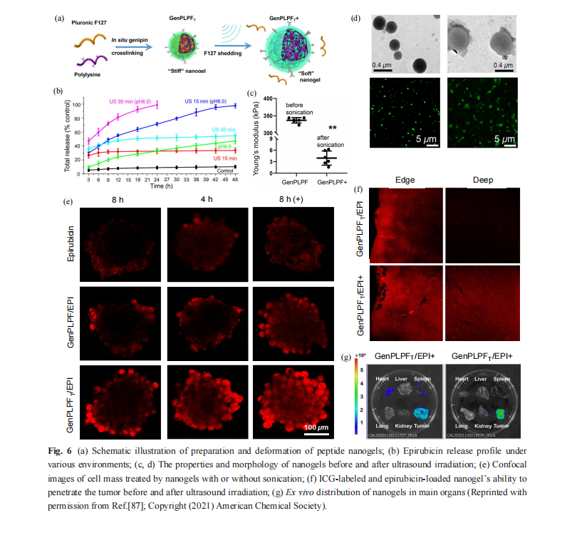 为了平衡深层肿瘤渗透和延长血液循环的矛 盾要求,Du 和Fan 课题组[87] 通过自组装制备了 一种“声致变形 ”多肽纳米凝胶 . 首先,将具有 靶向三阴性乳腺癌功能的ICAM- 1 抗体接枝于聚赖氨酸,并与Pluronic F127 共组装,然后通过京 尼平交联形成稳定的纳米凝胶结构(图6(a)). 该纳 米凝胶能够在血液中长期保持稳定,实现长效循 环;在外部超声波的作用下,多肽纳米凝胶能够 实现负载的表阿霉素的响应性释放(图6(b)). 超声 刺激同时也能降低肿瘤组织的间质压力,以促进 深层肿瘤富集 . 同时,多肽凝胶在超声作用后内 空化作用增强而明显膨胀,促进纳米凝胶软化且 变形性增强,利用原子力显微镜获得的力- 曲线 图来检测多肽纳米凝胶在超声刺激前后的硬度变 化,发现凝胶的杨氏模量在超声刺激15min 后从 336.78 kPa 下降到 3.93 kPa (图 6(c)). 此外,超声还可促进F127 分子从多肽纳米凝胶中脱落,进 而导致其形貌变化(图6(d)). 体外模拟三阴性乳腺 癌实体瘤模型表明,该纳米凝胶能在超声作用下 实现更好的肿瘤深层渗透和抑制效果(图6(e)). 小 鼠静脉注射后,相对刚性的纳米凝胶能通过主动 靶向和长效血液循环实现在肿瘤部位高水平的 富集 . 而在超声处理下,肿瘤部位的纳米凝胶变 得更加柔软,通过形变增强实现肿瘤深层穿透 (图 6(f)) ,最终达到低水平的系统毒性和更高水 平的抗耐药性肿瘤效果(图6(g)). 这种兼具内源性 刺激与外源性刺激响应的纳米载体有望解决延长 血液循环和肿瘤深部渗透的矛盾需求.