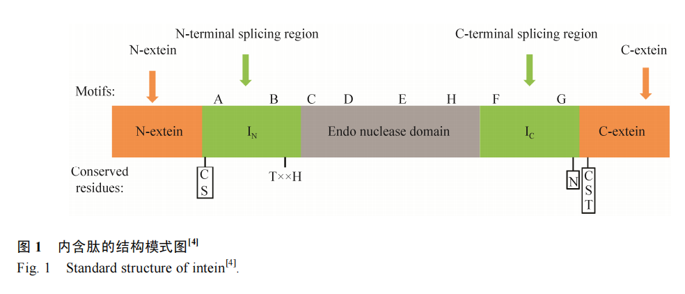 蛋白质内含肽(又称蛋白质内含子,Intein)是前体未成熟蛋白质中的一段多肽链,它通过一系列重排、转酯、环化等自我催化的反应过程,可以从前体蛋白中切除并将两端的蛋白多肽链(蛋白质外显肽,Extein)通过一个天然的肽键连接,即通过蛋白质自我剪接作用实现蛋白质结构的重新布局[2-3]。断裂内含肽是内含肽的一种结构类型。在结构上,它的N端区域(本文表示为IN)和C端区域(本文表示为IC)相互分离,而当IN和IC两个片段连接恢复结构后可按照标准内含肽剪接途径完成两端外显肽的拼接。