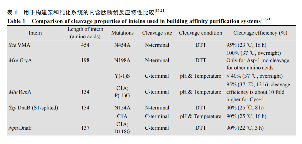 内含肽在亲和纯化中的应用最早在1997年。Ming等以C末端突变(Asn454Ala)的Sce VMA内含肽为基础,在其C端连接CBD (Chitin binding domain)亲和标签并在N端连接目标蛋白构建纯化体系进行蛋白纯化[9]。Sce VMA内含肽是最早被发现的1种内含肽。利用这种内含肽构建了商品化的IMPACTTM-CN (NEB)蛋白表达纯化体系。但这种内含肽的断裂速率较慢,对于N端断裂反应,23 ℃、有还原剂DTT诱导的条件下,达到95%的断裂率需要16 h[9]。C端断裂反应速率更低。而且,Sce VMA内含肽分子量较大(56 kDa),不利于前体蛋白的可溶性表达。