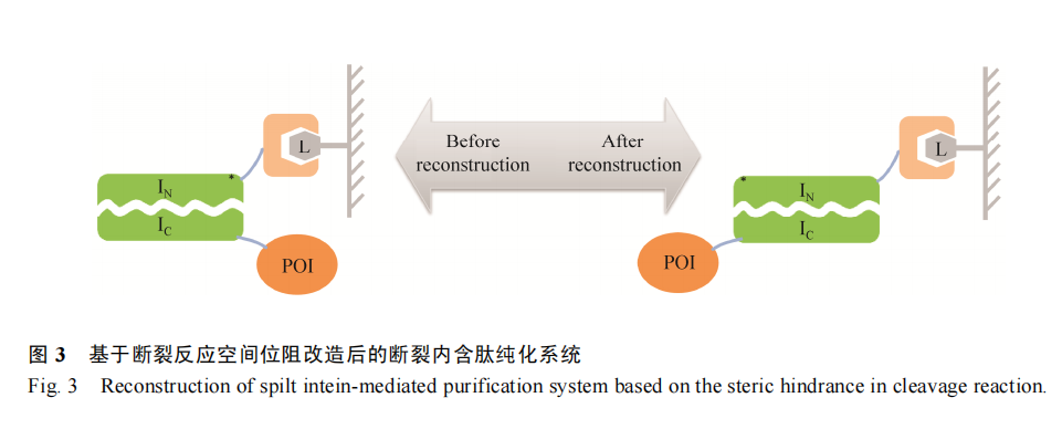 对断裂型内含肽来说,IN和IC两端连接肽链的大小对断裂反应速率也有影响。根据对Npu DnaE内含肽IN和IC相互识别结合作用方式的分析,如果多肽链分别位于IN和IC的两端(即N端和C端),此时空间位阻最大,断裂反应速率就会下降(图 3)。Chen等将位于INN端的亲和标签移动到C端,这样就降低了IN和IC亲和结合时的空间位阻,使断裂反应速率大大提高——在室温、DTT的条件下,30 min就可以完成全部的断裂反应[17]。