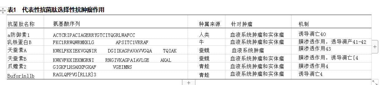 2.4.5 其他具有抗肿瘤特性的代表性抗菌肽 在结构 上,LTX-302 是一种源于其亲本肽LfcinB的9-聚体肽, 具有优化的α-螺旋二级结构,从而发挥巨大的抗肿瘤活 性。LTX-302在BALB/c小鼠体内建立的A2O-B 细胞淋巴 瘤模型中已被证实具有明显的抗肿瘤作用,其抗肿瘤活 性依赖于CD4 和CD8 淋巴T 细胞的活化,且最终LTX-302 给药诱导了针对淋巴瘤细胞的长效细胞免疫,最终导致 肿瘤消退[14。Buforin II是一种具有21残基的α-螺旋抗菌 肽,其序列与组蛋白H2A 的N 末端区域相似。Buforin IIB 是一种合成衍生的类似于Buforin II的化合物,经修饰后 在2个a-螺旋之间含有脯氨酸残基153]。在一项研究中发 现Buforin IIB对乳腺癌细胞MX-1 和MCF-7 具有抗癌活 性,并通过抗血管生成机制抑制小鼠动物模型中种植瘤 的生长15。由于此次综述篇幅有限,在该部分仅涉及到 以上具有代表性的抗菌肽。
