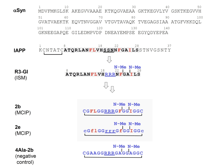 研究团队设计合成了大环肽2b和2e,这些肽模拟了IAPP的自交叉作用位点,并能够抑制IAPP和阿尔茨海默病(AD)中的淀粉样β肽(Aβ40/42)的淀粉样自组装。