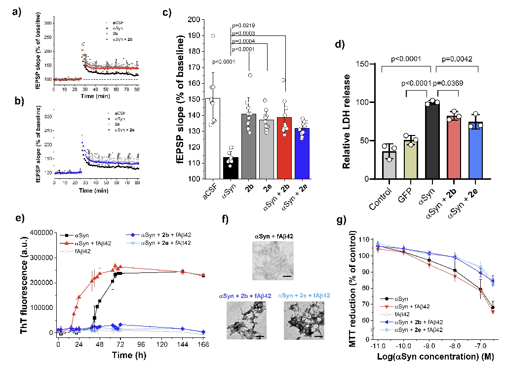 2b 和 2e 能减轻 αSyn 寡聚体对小鼠海马突触长时程增强(LTP)的损伤,保护过表达 αSyn 的神经元,抑制 Aβ42 纤维对 αSyn 的交叉引发作用,且对胰岛素纤维化无抑制作用。