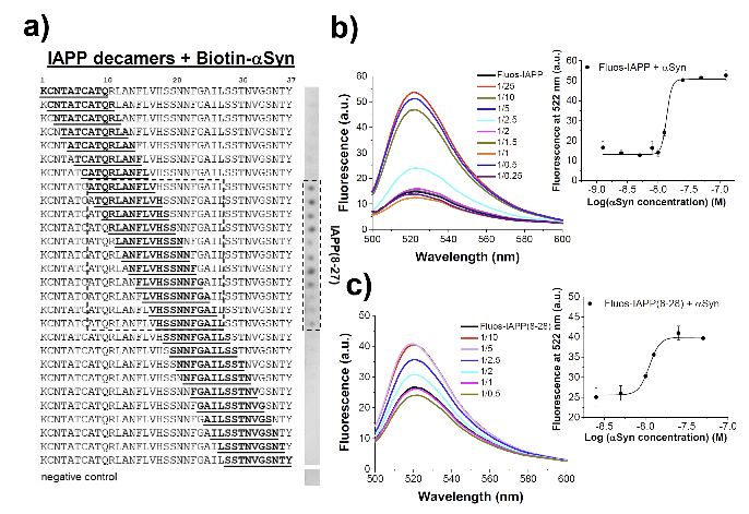 通过荧光光谱滴定和肽阵列分析,研究团队确定了αSyn的三个关键区域(αSyn(1–14)、αSyn(34–52)和αSyn(87–105))介导了其与MCTPs和IAPP的高亲和力相互作用。